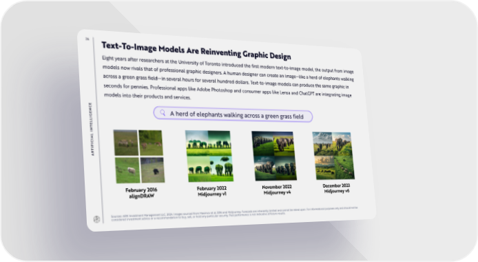 24 Text-To-Image Models Are Reinventing Graphic Design Eight years after researchers at the University of Toronto introduced the first modern text-to-image model, the output from image models now rivals that of professional graphic designers. A human designer can create an image—like a herd of elephants walking across a green grass field—in several hours for several hundred dollars. Text-to-image models can produce the same graphic in seconds for pennies. Professional apps like Adobe Photoshop and consumer apps like Lensa and ChatGPT are integrating image models into their products and services. E C N E A herd of elephants walking across a green grass field G I L L E T N I AL I C I F I T AR February 2016 February 2022 November 2022 December 2023 alignDRAW Midjourney v1 Midjourney v4 Midjourney v6 Sources: ARK Investment Management LLC, 2024. Images sourced from Masimov et al. 2016 and Midjourney. Forecasts are inherently limited and cannot be relied upon. For informational purposes only and should not be considered investment advice or a recommendation to buy, sell, or hold any particular security. Past performance is not indicative of future results.