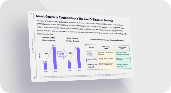 62 Smart Contracts Could Collapse The Cost Of Financial Services The value of financial assets globally ballooned from $140 trillion in 2000 to $510 trillion in 2020, thanks to a combination of global economic growth, increased financialization, and expanding equity multiples. The operating cost of the global financial system increased in tandem with the value of financial assets. At $20 trillion in total annual revenue, the aggregate financial services industry’s take rate has been 3.3% relative to the value of all financial assets. Smart contracts could lower this drag on the economy materially. S Value Of Global Global Financial Economic Impact of Financial Regulatory Compliance T Financial Assets Services Revenue C A R T N $510T $17T Cost To Current Cost Lowering O Activity C System Solution T R A Know Your SM 3.6x 3.3% agg. 3.3x Customer $1,500-$3,000+ per individual Unified digital identity take rate Verification verification verifiable across institutions Trillions Nasdaq Listing Fee $270k per listing + $52-$180k Direct DEX listing with global $140T $5T annually distribution Global Anti-Money $274 billion cost to the global Laundering financial system annually Auditable provenance of Compliance funds on global ledger 2000 2020 2000 2020 Sources: ARK Investment Management LLC, 2024. This ARK analysis is based on a range of underlying data from external sources, which are available upon request. Forecasts are inherently limited and cannot be relied upon. For informational purposes only and should not be considered investment advice or a recommendation to buy, sell, or hold any particular security. Past performance is not indicative of future results.