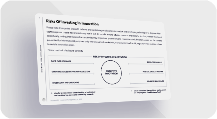 2 Risks Of Investing In Innovation Please note: Companies that ARK believes are capitalizing on disruptive innovation and developing technologies to displace older technologies or create new markets may not in fact do so. ARK aims to educate investors and seeks to size the potential investment opportunity, noting that risks and uncertainties may impact our projections and research models. Investors should use the content presented for informational purposes only, and be aware of market risk, disruptive innovation risk, regulatory risk, and risks related E to certain innovation areas. R U Please read risk disclosure carefully. OS L C S RISK OF INVESTING IN INNOVATION DI : 4 2 0 RAPID PACE OF CHANGE REGULATORY HURDLES 2 S A DE I G DISRUPTIVE BI EXPOSURE ACROSS SECTORS AND MARKET CAP POLITICAL OR LEGAL PRESSURE INNOVATION UNCERTAINTY AND UNKNOWNS COMPETITIVE LANDSCAPE à Aim for a cross-sector understanding of technology à Aim to understand the regulatory, market, sector, and combine top-down and bottom-up research. and company risks. (See Disclosure Page) Sources: ARK Investment Management LLC, 2023.