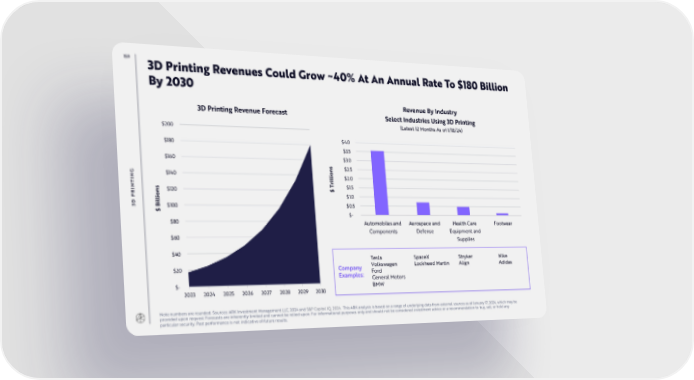 159 3D Printing Revenues Could Grow ~40% At An Annual Rate To $180 Billion By 2030 Revenue By Industry 3D Printing Revenue Forecast Select Industries Using 3D Printing $200 (Latest 12 Months As of 1/18/24) $180 $4.0 $3.5 $160 $3.0 G ns $2.5 $140 io N l $2.0 I il T r T $1.5 N I ns $120 $ R $1.0 P io l 3D il B $100 $0.5 $ $- $80 Automobiles and Aerospace and Health Care Footwear $60 Components Defense Equipment and Supplies $40 Tesla SpaceX Stryker Nike $20 Company Volkswagen Lockheed Martin Align Adidas Examples: Ford $- General Motors 2023 2024 2025 2026 2027 2028 2029 2030 BMW Note numbers are rounded. Sources: ARK Investment Management LLC, 2024 and S&P Capital IQ, 2024. This ARK analysis is based on a range of underlying data from external sources as of January 17, 2024, which may be provided upon request. Forecasts are inherently limited and cannot be relied upon. For informational purposes only and should not be considered investment advice or a recommendation to buy, sell, or hold any particular security. Past performance is not indicative of future results.