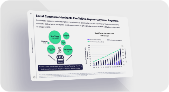 68 Social Commerce Merchants Can Sell to Anyone—Anytime, Anywhere Social media platforms are increasing their monetization of global audiences with e-commerce. Thanks to omnichannel solutions—both physical and digital—social commerce could grow 32% at an annual rate, from $730 billion today to over $5 trillion in 2030. Global Social Commerce Sales Instagram ARK Forecast YouTube 1.5B S 2.8B MAUs* Social Commerce (LHS) Traditional E-commerce (LHS) R E Social Commerce Share (RHS) M Pinterest TikTok U 0.4B S 1.1B N $18 30% CO e $16 L u A l 25% ce T WhatsApp Facebook a $14 r I V e G 1.8B 2.2B e ) $12 20% m DI is ns m io $10 co l 15% - il E chandr $8 r T f e O M ($ $6 10% e s s $4 har Shopify o 5% S Gr $2 Business Launch – Omnichannel Selling – Payment Processing – Marketing $- 0% Analytics and Management – Logistics & Shipping – Business Funding 2018 '19 '20 '21 '22 '23E '24E '25E '26E '27E '28E '29E '30E *We estimate each platform’s monthly active users (MAUs) across its iOS and Android mobile apps. Sources: ARK Investment Management LLC, 2024. This ARK analysis is based on a range of underlying data from external sources, including Sensor Tower, which may be provided upon request. Forecasts are inherently limited and cannot be relied upon. For informational purposes only and should not be considered investment advice or a recommendation to buy, sell, or hold any particular security. Past performance is not indicative of future results.