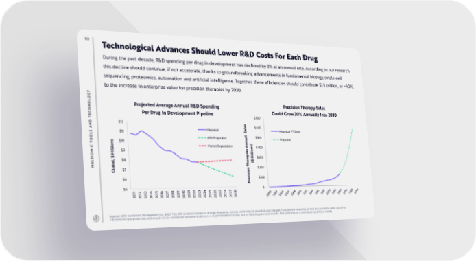 103 Technological Advances Should Lower R&D Costs For Each Drug During the past decade, R&D spending per drug in development has declined by 3% at an annual rate. According to our research, this decline should continue, if not accelerate, thanks to groundbreaking advancements in fundamental biology, single-cell sequencing, proteomics, automation and artificial intelligence. Together, these efficiencies should contribute $1.5 trillion, or ~40%, to the increase in enterprise value for precision therapies by 2030. Y G O L Precision Therapy Sales O Projected Average Annual R&D Spending HN Could Grow 30% Annually Into 2030 C Per Drug In Development Pipeline E $700 T D $12 s N e $600 A al Historical S Historical PT Sales S $11 L O ARK Projection al $500 Projected O $10 T ns ) Market Expectation C io Annu $400 l ns MI il $9 s io O M ie l I il T $ ap B $300 L , $8 r al he ($ MU b T o $7 n $200 Gl io $6 cis $100 e r P $5 1 2 3 4 5 6 7 8 9 $- 1 1 1 1 1 1 1 1 1 2122 23 2425 26 2728 29 0 20 3 0 2 4 6 8 0 2 4 6 8 0 20 20 2020 20 2020 2020 20 20 0 0 0 0 0 1 1 1 1 1 20 22 24 26 28 3 20 20 2020 20 2020 20 20 20 20 20 20 20 20 20 20 20 20 20 20 20 20 20 20 Sources: ARK Investment Management LLC, 2024. This ARK analysis is based on a range of external sources, which may be provided upon request. Forecasts are inherently limited and cannot be relied upon. For informational purposes only and should not be considered investment advice or a recommendation to buy, sell, or hold any particular security. Past performance is not indicative of future results.