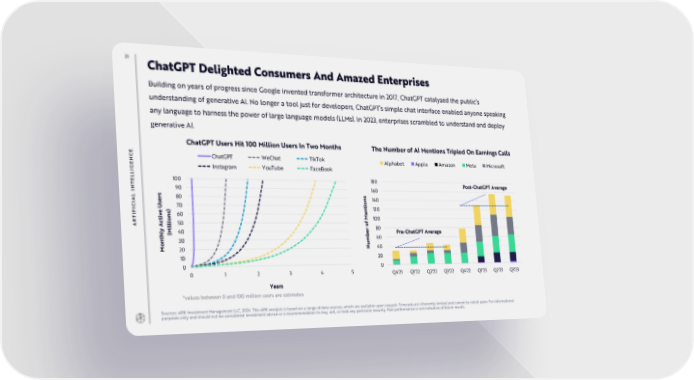 21 ChatGPTDelighted Consumers And Amazed Enterprises Building on years of progress since Google invented transformer architecture in 2017, ChatGPT catalyzed the public’s understanding of generative AI. No longer a tool just for developers, ChatGPT’s simple chat interface enabled anyone speaking any language to harness the power of large language models (LLMs). In 2023, enterprises scrambled to understand and deploy generative AI. ChatGPTUsers Hit 100 Million Users In Two Months The Number of AI Mentions Tripled On Earnings Calls E C ChatGPT WeChat TikTok Alphabet Apple Amazon Meta Microsoft N E Instagram YouTube FaceBook G I L L 100 180 E Post-ChatGPT Average T N 90 160 I s AL r 80 ns140 I e C s 70 io I U F ) nt120 I e ns60 e T iv M 100 io AR l 50 f Act o il 80 y r hl(M40 e Pre-ChatGPT Average b 60 nt 30 m o u 40 M 20 N 10 20 0 0 0 1 2 3 4 5 Q4'21 Q1'22 Q2'22 Q3'22 Q4'22 Q1'23 Q2'23 Q3'23 Years *values between 0 and 100 million users are estimates Sources: ARK Investment Management LLC, 2024. This ARK analysis is based on a range of data sources, which are available upon request. Forecasts are inherently limited and cannot be relied upon. For informational purposes only and should not be considered investment advice or a recommendation to buy, sell, or hold any particular security. Past performance is not indicative of future results.