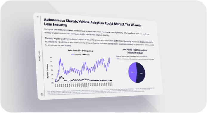 131 Autonomous Electric Vehicle Adoption Could Disrupt The US Auto Loan Industry During the past three years, interest rate hikes have increased new vehicle monthly car loan payments by ~27%, from $581 to $739. As a result, the number of subprime auto loans delinquent by 60+ days recently hit an all-time high. Thanks to Wright’s Law, EV prices should continue to fall, shifting more miles onto electric platforms and decreasing the value of gas-powered vehicles. As a result, the ~$1.6 trillion in auto loans currently sitting on financial institution balance sheets, issued predominantly for gas-powered vehicles, could be at risk over the next 10 years. Auto Loan 60+ Delinquency Auto Vehicle Fleet Composition IS (Trillions Of Dollars)* X Subprime Prime A Motor Vehicle Loans Owned And Securitized By Banks T O 6% B Motor Vehicle Loans On Consumer Balance Sheets (ARK Estimate) RO 5% ans4% o L f 3% O nt $1.3 T ce 2% $1.6 T r e P 1% 0% 3 4 5 6 7 8 9 1 2 3 4 5 6 7 8 9 1 2 3 4 5 6 7 8 9 0 0 1 1 1 1 1 1 1 1 1 21 9 9 9 9 9 9 9 0 0 0 0 0 0 0 0 0 0 1 20 20 2223 191919 19191919 20202020 2020202020 2020 20 20202020 20202020 202020 Note: Wright’s Law states that for every cumulative doubling of units produced, costs will fall by a constant percentage. *Motor Vehicle Loans Owned and Securitized data as of Q3 2023. ARK Investment Management LLC, 2024. This ARK analysis is based on a range of underlying data from external sources, as of January 3, 2024, which may be provided upon request. Forecasts are inherently limited and cannot be relied upon. For informational purposes only and should not be considered investment advice or a recommendation to buy, sell, or hold any particular security. Past performance is not indicative of future results.