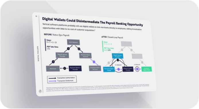 84 Digital Wallets Could Disintermediate The Payroll Banking Opportunity Vertical software platforms probably will use digital wallets to link merchants directly to employees, adding monetization opportunities with little to no cost of customer acquisition.* BEFORE: Status Quo Payroll AFTER: Closed-Loop Payroll Steps: ACH Network Steps: ACH Network 9 + 7 + 5 = 21 3 + 2 + 3 = 8 S PSP Take Rate: PSP Take Rate: T 19 20 E 1.1% 2.4% 2.8% L L A W Payroll Service Merchant Bank Payroll Service Merchant Bank L Provider** A Provider Account Account T I G 6 DI 18 21 In-Network In-Network Merchant 17 Payment Service Employee Bank Merchant Digital Payment Service Employee Provider Account Wallet 7 Provider 8 Digital Wallet Transaction Authorization Transaction Settlement *Payment processes and associated fee estimates are rendered for illustrative purposes only. **In this example, we assume the PSP offers a first-party or white-labeled third-party payroll solution. Sources: ARK Investment Management LLC, 2024. This ARK analysis is based on a range of underlying data from external sources, which may be provided upon request. Forecasts are inherently limited and cannot be relied upon. For informational purposes only and should not be considered investment advice or a recommendation to buy, sell, or hold any particular security. Past performance is not indicative of future results.