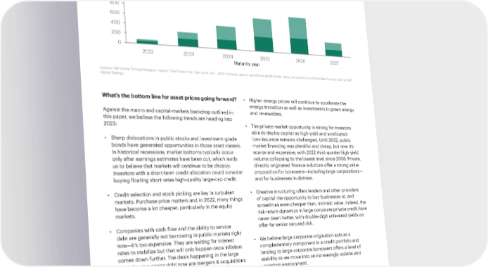 2023 ECONOMIC AND CAPITAL MARKETS OUTLOOK Exhibit 31: …and high-yield issuers SPECULATIVE-GRADE MATURING DEBT $bn Fixed Floating 1,000 800 600 400 200 0 2022 2023 2024 2025 2026 2027 Maturity year Source: S&P Global Ratings Research, Apollo Chief Economist. Data as of July 1, 2022. Includes issuers’ speculative-grade bonds, loans, and revolving credit facilities that are rated by S&P Global Ratings. What’s the bottom line for asset prices going forward? • Higher energy prices will continue to accelerate the energy transition as well as investments in green energy Against the macro and capital-markets backdrop outlined in and renewables. this paper, we believe the following trends are heading into 2023: • The private market opportunity is strong for investors able to deploy capital as high-yield and syndicated- • Sharp dislocations in public stocks and investment-grade loan issuance remains challenged. Until 2022, public bonds have generated opportunities in those asset classes. market financing was plentiful and cheap, but now it’s In historical recessions, market bottoms typically occur scarce and expensive, with 2022 third-quarter high-yield only after earnings estimates have been cut, which leads volume collapsing to the lowest level since 2008. Private, us to believe that markets will continue to be choppy. directly originated finance solutions offer a strong value Investors with a short-term credit allocation could consider proposition for borrowers—including large corporations— buying floating short rates high-quality large-cap credit. and for businesses in distress. • Credit selection and stock picking are key in turbulent • Creative structuring offers lenders and other providers markets. Purchase price matters and in 2022, many things of capital the opportunity to buy businesses at, and have become a lot cheaper, particularly in the equity sometimes even cheaper than, intrinsic value. Indeed, the markets. risk-return dynamics in large corporate private credit have never been better, with double-digit unlevered yields on • Companies with cash flow and the ability to service offer for senior secured risk. debt are generally not borrowing in public markets right now—it’s too expensive. They are waiting for interest • We believe large corporate origination acts as a rates to stabilize but that will only happen once inflation complementary component in a credit portfolio and comes down further. The deals happening in the large lending to large corporate borrowers offers a level of capitalization space right now are mergers & acquisitions stability as we move into an increasingly volatile and (M&A), leveraged buyouts (LBO), corporate carve-outs, uncertain environment. and public-to-private transactions, with spreads the widest they have been in a long time. • The conditions that have fueled momentum-based private equity strategies—low inflation, rising valuations, plentiful The information herein is provided for educational purposes only and should not be construed as financial or investment advice, nor should any information in this document be relied on when making an investment decision. Opinions and views expressed reflect the current opinions and views of the author(s) and Apollo Analysts as of the date hereof and are subject to change. Please see the end of this document for important disclosure information. 21