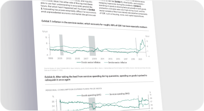 2023 ECONOMIC AND CAPITAL MARKETS OUTLOOK Whatever its cause, the trajectory of inflation has the past few years. The latest data, however, have begun to proven difficult to forecast provide some clarity about the overall picture of inflation as well as the prognosis going forward. While it would seem a very important distinction which argument one believes—Was it demand or supply that After spiking during Covid, inflation of goods has fallen has driven prices up?—it’s crucial to realize that both sharply in recent months, while inflation in the service sector explanations are seeking to explain the past, or that which remains on the rise (Exhibit 7). After briefly—and violently— has already happened. But there’s a related, and arguably swapping trajectories during the pandemic (Exhibit 8), more crucial, issue: Has either side of the argument been spending on goods is slowing because growth in both goods able to use their understanding to accurately predict the production and sales were very high during Covid, and the future, that which hasn’t happened yet? As shown in Exhibit sector consists of the more interest rate-sensitive components 2, forecasting has proven remarkably difficult for economists of GDP, such as housing, autos, and capital expenditures. amid unprecedented economic and market disruptions over Exhibit 7: Inflation in the services sector, which accounts for roughly 80% of GDP, has been especially stubborn %Yo %YoY Y 11 11 6 6 1 1 -4 -4 1999 2001 2003 2005 2007 2009 2011 2013 2015 2017 2019 2021 Goods sector inflation Service sector inflation Source: Bureau of Labor Statistics (BLS), Haver Analytics, Apollo Chief Economist (Note: Goods = Commodities Less Food & Energy Commodities; Service = Services Less Energy Services). Data as of October 31, 2022. Exhibit 8: After taking the lead from services spending during quarantine, spending on goods is poised to relinquish it once again PERSONAL CONSUMPTION EXPENDITURES PRICE INDEX % Goods spending ( erices spending ( % 36 71 69 34 67 32 65 30 1 1 2 5 7 7 1 2 5 7 1 2 2 63 3 4 4 6 8 9 0 0 1 1 3 3 4 1 6 6 1 8 9 9 0 2 0 0 0 0 0 1 1 1 1 1 1 1 1 1 1 2 2 2 0 0 0 0 0 0 0 l l t l t r t l r t r t l r t n c r n t l r n t l r n c u p n c u p n c u p n c p n c a u p a c u p a c u p a J a J a J a u a J O J A J O J A J O J A J O A J O A J O A J O J A J O Source: Bureau of Labor Statistics (BLS), Haver Analytics, Apollo Chief Economist (Note: Goods = Commodities Less Food & Energy Commodities; Service = Services Less Energy Services). Data as of October 31, 2022. The information herein is provided for educational purposes only and should not be construed as financial or investment advice, nor should any information in this document be relied on when making an investment decision. Opinions and views expressed reflect the current opinions and views of the author(s) and Apollo Analysts as of the date hereof and are subject to change. Please see the end of this document for important disclosure information. 06