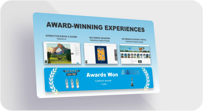 AWARD-WINNING EXPERIENCES INTERACTIVE E-BOOK & GUIDES MULTIMEDIA MAGAZINE ON DEMAND CONTENT PORTAL Salesforce Salesforce AppExchange Salesforce AppExchange Awards Won 3 platinum awards 1 Gold