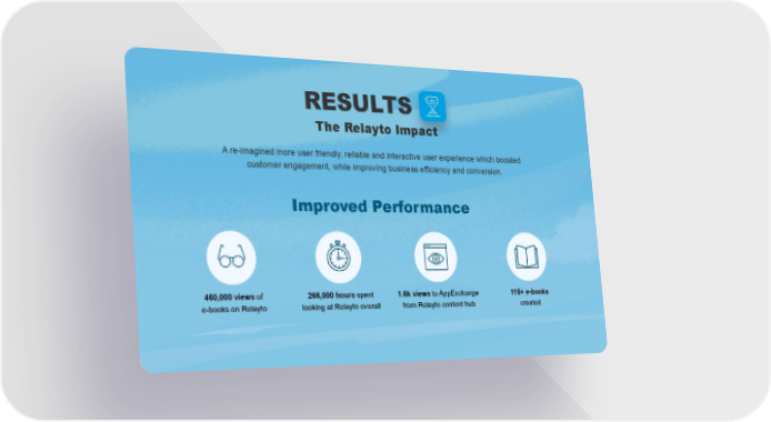 RESULTS The Relayto Impact A re-imagined more user friendly, reliable and interactive user experience which boosted customer engagement, while improving business efficiency and conversion. Improved Performance 460,000 views of 266,000 hours spent 1.6k views to AppExchange 115+ e-books e-books on Relayto looking at Relayto overall from Relayto content hub created