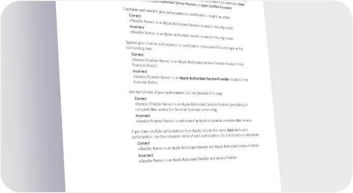 Using Apple Authorizations in Text Referring to your Apple authorization in text On web pages, printed materials, and other communications that describe your company’s capabilities, you can refer to your Apple authorization in text. In body copy and headlines, include the name Apple along with your authorization or certification; for example, Apple Authorized Reseller, Apple Authorized Service Provider, or Apple Certified Associate. Capitalize each word in your authorization or certification—treat it as a title. Correct is an Apple Authorized Reseller located in the city center. Incorrect is an Apple authorized reseller located in the city center. Typeset your channel authorization or certification in the same font and style as the surrounding text. Correct is an Apple Authorized Service Provider located in the financial district. Incorrect is an Apple Authorized Service Provider located in the financial district. Use the full title of your authorization. Do not describe it in copy. Correct is an Apple Authorized Service Provider specializing in complete Mac service for the small business community. Incorrect is authorized by Apple to provide complete Mac service. If you have multiple authorizations from Apple, include the name Apple with each authorization. Use the complete name of each authorization. Do not shorten or abbreviate. Correct is an Apple Authorized Reseller and Apple Authorized Service Provider. Incorrect is an Apple Authorized Reseller and Service Provider. Apple Identity Guidelines for Channel Affiliates and Apple-Certified Individuals August 2016 57
