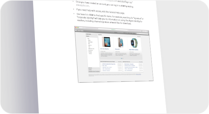 Apple Sales Web Apple Sales Web (ASW) provides advertising materials, data sheets, FAQs, product part numbers, pricing information, presentations, product videos, product photography, and more. Your Apple representative can provide more information about ASW. • To register for access, visit https://daw.apple.com and click “Sign Up.” • Once you have created an account, you can log in to ASW by visiting asw.apple.com. • If you need help with access, visit the General Help page. • Use Search in ASW to find specific items. For example, searching for “signature” or “corporate identity” will take you to information on using the Apple identity for resellers, including channel signature artwork files for download. Apple Identity Guidelines for Channel Affiliates and Apple-Certified Individuals August 2016 5