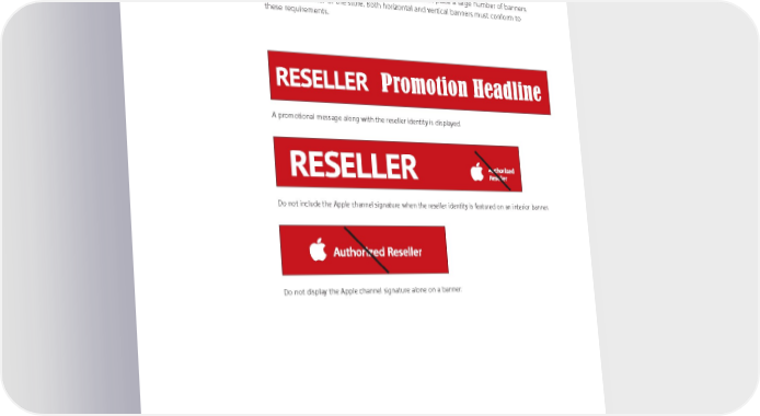 Store Interior, Banners For temporary promotions such as product launches, banners can be used to display a promotional message along with the store identity. The Apple channel signature cannot be displayed on store banners. Do not use banners for permanent signage. Banners should be used only for temporary promotions. Do not place a large number of banners around the interior of the store. Both horizontal and vertical banners must conform to these requirements. A promotional message along with the reseller identity is displayed. Do not include the Apple channel signature when the reseller identity is featured on an interior banner. Do not display the Apple channel signature alone on a banner. Apple Identity Guidelines for Channel Affiliates and Apple-Certiļ¬ed Individuals August 2016 55