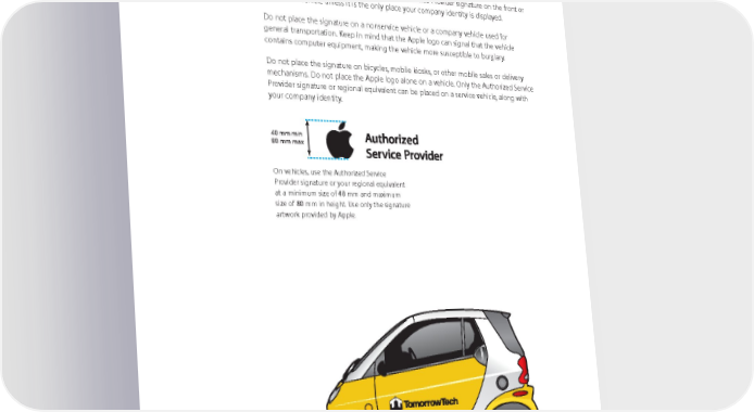 Vehicles Only the Apple Authorized Service Provider signature or its equivalent for your region can be displayed on a vehicle that is used to service equipment. Use only one signature on each side of the vehicle. Your company identity must also be displayed on each side of the vehicle. Do not place the Apple Authorized Service Provider signature on the front or back of the vehicle unless it is the only place your company identity is displayed. Do not place the signature on a nonservice vehicle or a company vehicle used for general transportation. Keep in mind that the Apple logo can signal that the vehicle contains computer equipment, making the vehicle more susceptible to burglary. Do not place the signature on bicycles, mobile kiosks, or other mobile sales or delivery mechanisms. Do not place the Apple logo alone on a vehicle. Only the Authorized Service Provider signature or regional equivalent can be placed on a service vehicle, along with your company identity. 40 mm min 80 mm max On vehicles, use the Authorized Service Provider signature or your regional equivalent at a minimum size of 40 mm and maximum size of 80 mm in height. Use only the signature artwork provided by Apple. Apple Identity Guidelines for Channel Affiliates and Apple-Certiļ¬ed Individuals August 2016 23