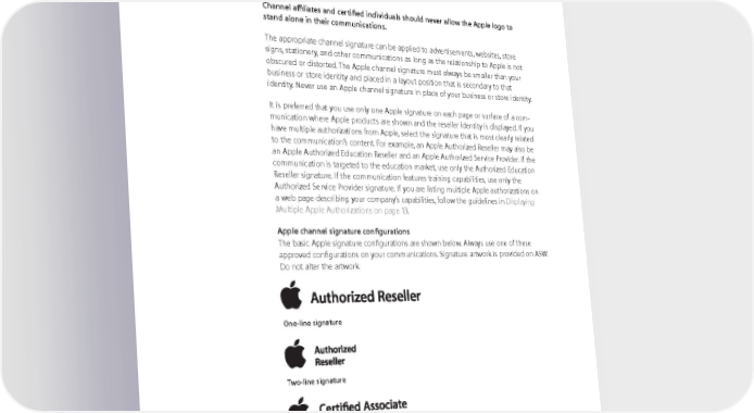 Apple Channel Signatures A signature is the combination of the Apple logo with a logotype—a name like “Authorized Reseller” set in specially designed type. Apple channel signatures communicate your relationship to Apple. Always use the correct signature based on your contractual relationship with Apple. Channel affiliates and certified individuals should never allow the Apple logo to stand alone in their communications. The appropriate channel signature can be applied to advertisements, websites, store signs, stationery, and other communications as long as the relationship to Apple is not obscured or distorted. The Apple channel signature must always be smaller than your business or store identity and placed in a layout position that is secondary to that identity. Never use an Apple channel signature in place of your business or store identity. It is preferred that you use only one Apple signature on each page or surface of a com- munication where Apple products are shown and the reseller identity is displayed. If you have multiple authorizations from Apple, select the signature that is most clearly related to the communication’s content. For example, an Apple Authorized Reseller may also be an Apple Authorized Education Reseller and an Apple Authorized Service Provider. If the communication is targeted to the education market, use only the Authorized Education Reseller signature. If the communication features training capabilities, use only the Authorized Service Provider signature. If you are listing multiple Apple authorizations on a web page describing your company’s capabilities, follow the guidelines in Displaying Multiple Apple Authorizations on page 13. Apple channel signature configurations The basic Apple signature configurations are shown below. Always use one of these approved configurations on your communications. Signature artwork is provided on ASW. Do not alter the artwork. One-line signature Two-line signature Certification signature with descriptor Apple certifications are awarded to qualifying individuals, not businesses. See Apple-Certified Individuals on page 29. Some certifications include a descriptor in smaller type. Use only the artwork provided by Apple. In some regions, localized Apple channel signatures are offered only in limited configurations due to differences in translation length. Apple Identity Guidelines for Channel Affiliates and Apple-Certified Individuals August 2016 7