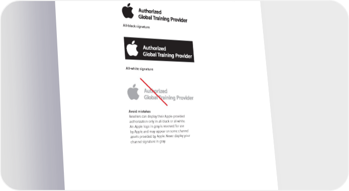 Signature Color Apple channel signatures can be displayed only in all-black or all-white. When placing a signature on color backgrounds, use an all-white signature reversed out of the background color. Never place an Apple channel signature on a visually cluttered or patterned background. All-black signature All-white signature Avoid mistakes Resellers can display their Apple-provided authorization only in all-black or all-white. An Apple logo in gray is reserved for use by Apple and may appear on some channel assets provided by Apple. Never display your channel signature in gray. Apple Identity Guidelines for Channel Affiliates and Apple-Certiļ¬ed Individuals August 2016 9