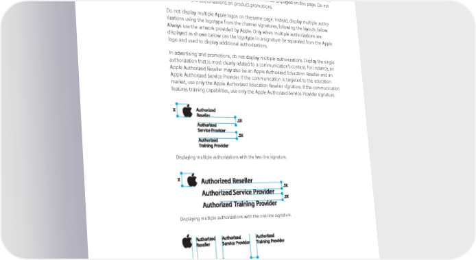 Displaying Multiple Apple Authorizations If your company has multiple authorizations from Apple, you can display them on your company’s web page that describes your business capabilities. For example, an About Us or Overview page on your website may provide information on all the services offered at your store location. Multiple Apple authorizations can be displayed on this page. Do not display multiple authorizations on product promotions. Do not display multiple Apple logos on the same page. Instead, display multiple autho- rizations using the logotype from the channel signatures, following the layouts below. Always use the artwork provided by Apple. Only when multiple authorizations are displayed as shown below can the logotype in a signature be separated from the Apple logo and used to display additional authorizations. In advertising and promotions, do not display multiple authorizations. Display the single authorization that is most clearly related to a communication’s content. For instance, an Apple Authorized Reseller may also be an Apple Authorized Education Reseller and an Apple Authorized Service Provider. If the communication is targeted to the education market, use only the Apple Authorized Education Reseller signature. If the communication features training capabilities, use only the Apple Authorized Service Provider signature. Displaying multiple authorizations with the two-line signature. Displaying multiple authorizations with the one-line signature. Optional: two-line signature with horizontal alignment. Apple Identity Guidelines for Channel Affiliates and Apple-Certified Individuals August 2016 13