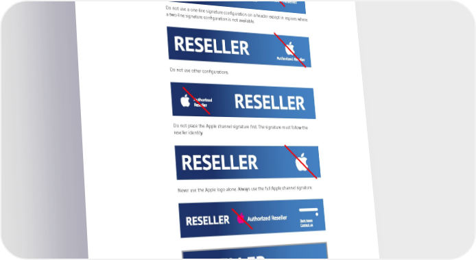RESELLER Avoid Header Mistakes RESELLER Do not use a one-line signature configuration on a header except in regions where a two-line signature configuration is not available. Do not use other configurations. RESELLER Do not place the Apple channel signature first. The signature must follow the reseller identity. Never use the Apple logo alone. Always use the full Apple channel signature. RESELLER Do not add color to any portion of the Apple channel signature. The signature must appear in all-black or all-white. Apple Identity Guidelines for Channel Affiliates and Apple-Certified Individuals August 2016 16