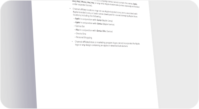 Naming and Identity Practices Apple trademarks and trade dress cannot be used in channel affiliate store or company names, web or social media site names, service names, or signage. Examples include the following: • Channel affiliate store names and company names cannot contain the names Apple, Mac, iPad, iPhone, iPod, Pod, or any other Apple trademarks (unless expressly authorized under separate license). • Channel affiliate locations may not use Apple-branded icons, terms associated with Apple-branded icons, or trade names developed for use exclusively by Apple Store locations, including the following: – Apple in conjunction with Camp (Apple Camp) – Apple in conjunction with Genius (Apple Genius) – Genius Bar – Mac in conjunction with Genius (Mac Genius) – One to One – Personal Shopping • Channel-affiliated store or marketing program logos cannot incorporate the Apple logo or any design containing an apple or detached leaf element. Apple Identity Guidelines for Channel Affiliates and Apple-Certified Individuals August 2016 36