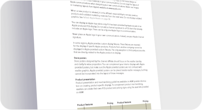 Store Interior, Communications Point-of-sale assets from Apple Apple provides channel affiliates with a variety of point-of-sale (POS) materials. These items may include banners, posters, brochures, and promotional merchandise. Always use the materials as provided; do not alter them in any way. Do not reuse design or text elements from these materials in your communications. Do not copy the layout of Apple communications when designing your own communications. Never use images or marketing layouts from Apple’s website at www.apple.com. When a new product is released, it is the affiliate’s responsibility to remove previous products and outdated marketing materials from the retail area. Do not display outdated graphics. See Refresh Apple Assets on page 32. You can display an Apple logo alone only if it has been provided by Apple as part of an Apple-produced POS display. Do not add a channel signature to a POS item that already includes an Apple logo. There can be only one Apple logo in a communication. Never place an Apple logo in your own communications. Instead, use your Apple channel signature. In some regions, Apple provides custom display fixtures. These fixtures are reserved for the display of specific Apple products. Products from another company cannot be displayed in Apple-provided custom fixtures. The only exception is third-party accessories that are directly related to the Apple product on display. Store posters Store posters designed by the channel affiliate should focus on the reseller identity and clarify its value proposition. You can complement your interior displays with Apple- provided posters, but make sure the Apple-provided posters are not confused with reseller graphics. Apple-provided posters can be placed beside reseller messages, but they cannot be incorporated into the layout of those messages. Product presentation Product presentation and merchandising guidelines available on ASW provide informa- tion on creating product-specific displays. To complement product merchandising, resellers can create their own POS product and pricing signs using the asset kits provided on ASW. Product features Pricing Product features Pricing Apple Identity Guidelines for Channel Affiliates and Apple-Certified Individuals August 2016 51