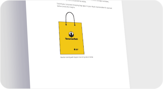 Shopping Bags One Apple channel signature can be placed on a shopping bag, along with your store identity. The signature should be placed on the front of the bag, below your own branding, and should be no larger than 50 percent of the cap height of the reseller logotype. The signature should not be placed too low; when the bag is set down, the channel signature should still be visible. Submit your proposed shopping bag layout to your Apple representative for approval before production begins. Reseller identity with Apple channel signature below Apple Identity Guidelines for Channel Affiliates and Apple-Certiļ¬ed Individuals August 2016 26