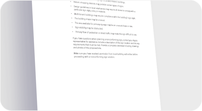 Store Exterior, Nonconforming Signs Sometimes exterior signage requires a variance from local building codes or does not conform to standard sign practices. Here are some examples that may require a nonconforming sign solution: • Building codes may restrict signage to protect historic buildings. • Historic shopping districts may prohibit certain types of signs. • Design guidelines in local retail zones may require all stores to comply with a particular sign style, color, or material. • Multi-tenant buildings may require compliance with the building’s sign style. • The building shape may be unusual. • The area available for primary signage may be an unusual shape or size. • Sign visibility may be obstructed. • Primary flow of pedestrian or street traffic may make the sign difficult to see. If you have questions when planning a nonconforming sign, contact your Apple representative for assistance. Include a description of the sign location and list any requirements that must be met. Provide a complete overview including drawings and photos of the proposed site. Make sure you have received permission from local building authorities before proceeding with a nonconforming sign solution. Apple Identity Guidelines for Channel Affiliates and Apple-Certified Individuals August 2016 46