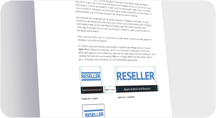 Store Interior, Signs It is a well-known retail principle that clear, uncluttered spaces allow customers to access product displays more easily. Use interior signage only if you have plenty of wall space and can provide a plain white unobstructed wall for the signs. Do not display the Apple channel signature inside your store. Never display the Apple logo alone in your store. Your store identity can be displayed alone, or it can be accompa- nied by your channel authorization in text using the typographic style of your company’s communications. Follow the recommended layout shown below, with the authorization in white reversed out of a horizontal black bar below the reseller identity. Use standard sign materials such as acrylic, Perspex, or Plexiglas. Illumination, if used, should be cast evenly across the entire sign surface using neutral white light. The Apple authorization text can be internally illuminated only if the reseller identity is also internally illuminated. Do not use colored lights or filters to create a lighting effect on the Apple authorization. Place only one interior sign in a store area on a plain white unobstructed wall, away from displays or promotional graphics. On interior signs, promote your authorization only with text. Always spell out the word Apple. When designing a new sign, use the recommended configuration shown here — white text reversed out of a black bar placed at the lower edge of the sign below your store identity. The black bar cannot exceed 100 mm in height. Match the typographic style of your company’s communications. Do not imitate Apple typography. Apple Authorized Reseller 100 mm max Apple Authorized Reseller Preferred—square Optional—rectangle Do not place the Apple channel signature on an interior sign. Show your authorization in text only, or display only your store identity. Apple Identity Guidelines for Channel Affiliates and Apple-Certified Individuals August 2016 54