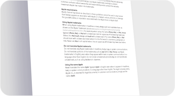 Using Apple Trademarks Apple trademarks A trademark can be a name, a logo, or even a slogan—any word, symbol, or device used to identify a company’s products or services and distinguish them from those of other companies. Because trademarks are essential in building strong brands, they are extremely valuable assets. It is important that you use Apple trademarks carefully to prevent customer confusion about ownership and responsibility and to protect the valuable investment Apple has made in its trademarks. Apple requirements Apple channel signatures as described in these guidelines cannot be used in any manner that falsely suggests an association with Apple or is likely to reduce, diminish, or damage the goodwill, value, or reputation associated with the Apple Store or Apple itself. Using Apple trademarks When using Apple trademarks in headlines or text, always spell and capitalize them as shown on the Apple Trademark List at www.apple.com/legal/intellectual-property/ trademark/appletmlist.html. For example, when using the name iPhone, iPad, or iPod, always typeset iPhone, iPad, or iPod with a lowercase i and an uppercase P followed by lowercase letters. For iPod touch, always set touch with a lowercase t. The name iPhone, iPad, or iPod should start with a lowercase i even when it is the first word in a sentence, paragraph, or title. Never set Mac in all capital letters. Use an uppercase M followed by lowercase letters. Do not translate Apple trademarks Do not translate any Apple trademarks in headlines, body copy, or spoken communications. Do not translate portions of the trademark, such as pad within iPad. Always use Apple trademarks in English, even when they appear within text or spoken communications in a language other than English. Do not render a trademark phonetically; do not transliterate a trademark, such as using katakana in Japanese. Using the name Apple Never translate the name Apple. Typeset Apple in English even when it appears in headlines, text, or spoken communications in a language other than English. The legal company name, Apple Inc., is reserved for legal documents; in customer communications, simply use the name Apple. Apple Identity Guidelines for Channel Affiliates and Apple-Certified Individuals August 2016 61