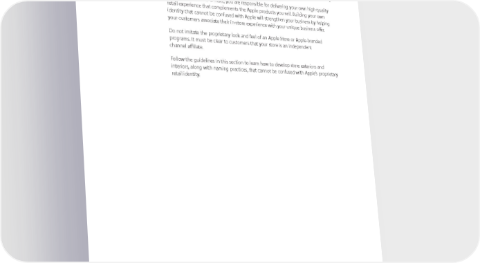 Reseller Store Identity Apple trademarks and trade dress include the terms and fixtures developed by Apple for use in the Apple Store and Apple-branded programs. This intellectual property, owned by Apple, contributes to the proprietary look and feel of the Apple retail identity. As an Apple channel affiliate, you are responsible for delivering your own high-quality retail experience that complements the Apple products you sell. Building your own identity that cannot be confused with Apple will strengthen your business by helping your customers associate their in-store experience with your unique business offer. Do not imitate the proprietary look and feel of an Apple Store or Apple-branded programs. It must be clear to customers that your store is an independent channel affiliate. Follow the guidelines in this section to learn how to develop store exteriors and interiors, along with naming practices, that cannot be confused with Apple’s proprietary retail identity. Apple Identity Guidelines for Channel Affiliates and Apple-Certified Individuals August 2016 35