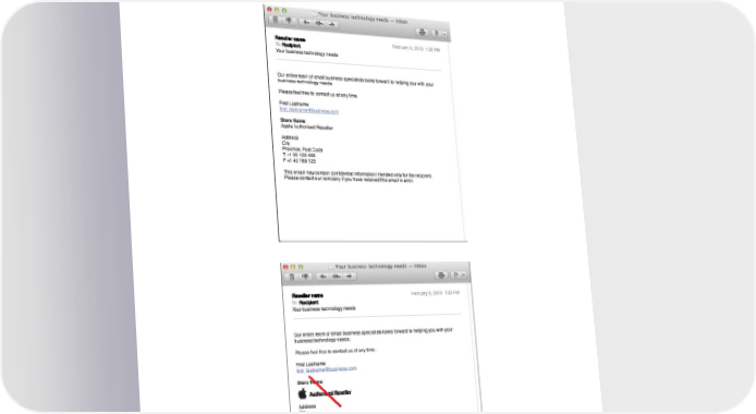 Email Signatures Do not include an Apple channel signature at the end of your email. Instead, refer to your Apple authorization in text. Your Apple channel signature can appear on headers for email promotions along with your reseller identity; see Using the Apple Channel Signature on Headers on page 15. Apple Identity Guidelines for Channel Affiliates and Apple-Certiļ¬ed Individuals August 2016 18