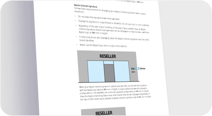 Store Exterior, Signature Placement at Eye Level Placement The Apple channel signature can be placed lower on the storefront, at approximately eye level. Do not place a signature below eye level. When placing the Apple channel signature lower on your facade, size the signature so that the Apple logo is 100 mm in height. Apple channel signature Follow these requirements for displaying your Apple channel signature lower on your storefront: • Do not place the signature lower than eye level. • Display the signature in only all-black or all-white. Do not use color or color materials. • Regardless of the size of your building or the size of your reseller logo, an Apple channel signature placed near eye level can be displayed in only one size—with the Apple logo at 100 mm in height. • If other brands are also displayed, place the Apple channel signature near the other brand identities. • Never use the Apple logo alone on your store exterior. When your Apple channel signature is placed near eye level, use the two-line signature with the Apple logo sized at 100 mm in height. In regions where the two-line signature configuration is not available, use a one-line signature configuration at 100 mm in height. Place the Apple channel signature near other brands that are also displayed. Regardless of the size of other brand logos, display the Apple channel signature only at 100 mm in height. For window clings, the Apple logo is 100 mm in height. See Store Exterior, Window Cling on page 43. Apple Identity Guidelines for Channel Affiliates and Apple-Certified Individuals August 2016 42