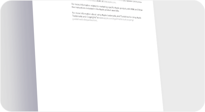 For More Information If you need more information or have questions about using these guidelines, contact the Apple account representative or sales administrator in your region. For signature artwork and information related to Apple Authorized Reseller communica- tions, go to Apple Sales Web (ASW) at asw.apple.com. For more information related to marketing specific Apple products, visit ASW and follow the instructions included in the Apple product asset kits. For more information about using Apple trademarks, visit “Guidelines for Using Apple Trademarks and Copyrights” at www.apple.com/legal/intellectual-property/ guidelinesfor3rdparties.html. © 2016 Apple Inc. All rights reserved. Apple, the Apple logo, Apple TV, iBooks, iPad, iPhone, iPod, iPod nano, iPod touch, iTunes, Lightning, Mac, MacBook Air, MacBook Pro, and OS X are trademarks of Apple Inc., registered in the U.S. and other countries. AppleCare, Apple Store, App Store, Genius Bar, and One to One are service marks of Apple Inc., registered in the U.S. and other countries. OS X Server Essentials is a service mark of Apple Inc. IOS is a trademark or registered trademark of Cisco in the U.S. and other countries and is used under license. Other product and company names mentioned herein may be trademarks of their respective companies. Any statement made by an Apple representative that contradicts these guidelines is expressly unauthorized and disclaimed by Apple. L502568B-en_US Apple Identity Guidelines for Channel Affiliates and Apple-Certified Individuals August 2016 64