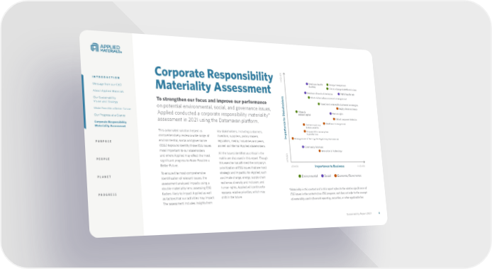 INTRODUCTION Message from our CEO About Applied Materials Our Sustainability Vision and Strategy Make Possible a Better Future Our Progress at a Glance Corporate Responsibility Materiality Assessment PURPOSE PEOPLE PLANET PROGRESS Sustainability Report 2021 8 To strengthen our focus and improve our performance on potential environmental, social, and governance issues, Applied conducted a corporate responsibility materiality* assessment in 2021 using the Datamaran platform. Corporate Responsibility Materiality Assessment This automated solution helped us comprehensively review a wide range of environmental, social and governance (ESG) topics to identify those ESG issues most important to our stakeholders and where Applied may effect the most significant progress to Make Possible a Better Future. To ensure the most comprehensive identification of relevant issues, the assessment analyzed impacts using a double-materiality lens: assessing ESG factors likely to impact Applied as well as factors that our activities may impact. The assessment includes insights from key stakeholders, including customers, investors, suppliers, policy makers, regulators, media, industries and peers, as well as internal Applied stakeholders. All the issues identified as critical in the matrix are discussed in this report. Though this exercise has affirmed the company’s prioritization of ESG issues that are most strategic and impactful for Applied, such as climate change, energy, supply chain resilience, diversity and inclusion, and human rights, Applied will continue to reassess relative priorities, which may shift in the future. * Materiality in this context and in this report refers to the relative significance of ESG issues in the context of our ESG program, and does not refer to the concept of materiality used in financial reporting, securities, or other applicable law. Importance to Stakeholders Importance to Business H I G HER H I G HER L O WER L O WER Innovation & Technology Community Relations Water & natural capital Employee health & safety Supply chain resilience Public health risk Climate change & GHG emissions Energy management Transition to renewable & alternative energies Management of the Legal & Regulatory Environment Responsible consumption & production Customer privacy & data security Ethical corporate behavior Human rights Workforce management Environmental Social Economic/Governance Waste & hazardous materials management Employee diversity & inclusion INTRODUCTION Message from our CEO About Applied Materials Our Sustainability Vision and Strategy Make Possible a Better Future Our Progress at a Glance Corporate Responsibility Materiality Assessment PURPOSE PEOPLE PLANET PROGRESS