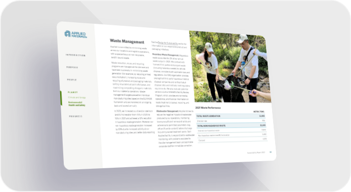 Sustainability Report 2021 63 Waste Management Applied is committed to minimizing waste across our locations and logistics operations, with a special focus on non-recyclable, landfill-bound waste. Waste reduction, reuse, and recycling programs are managed at the site level and have been successful in minimizing waste generation (for example, by reducing printed documentation), increasing reuse and recycling of product and packaging materials, sorting recyclables at point of disposal, and maximizing composting of organic materials from our cafeteria operations. Waste management targets are set for individual manufacturing sites based on the ISO 14001 framework and are reviewed on an ongoing basis and scored annually. In 2021, we increased our diversion rate from landfill/incineration from 75% in 2020 to 76% in 2021 and achieved a 12% reduction in hazardous waste generation. However, our non-hazardous waste generation increased by 50% due to increased activity at our manufacturing sites and better data reporting. See the Design for Sustainability section for information on our responsible product and packaging initiatives. Hazardous Waste Management: Hazardous waste accounted for 2% of our annual waste output in 2021. We contract with licensed third parties to transport waste (including hazardous waste) for off-site disposal, consistent with applicable laws and regulations. Our EHS organization provides oversight of third-party hazardous material disposal companies and verifies that all disposal sites and methods meet regulatory requirements. We also evaluate potential vendors via the CHWMEG Facility Review Program, which provides environmental, operational, and financial information on waste treatment, disposal, recycling, and storage facilities. Wastewater Management: Applied strives to reduce the negative impacts of wastewater produced by our operations, monitoring to ensure sufficient removal of solids and adherence to permitted parameters (e.g., pH and fluoride content) before discharge to publicly owned treatment works. Each Applied facility is responsible for wastewater monitoring, with problems escalated to the site management team and applicable corporate staff for immediate correction. METRIC TONS TOTAL WASTE GENERATION 22,900 Diversion rate 76% TOTAL NON-HAZARDOUS WASTE 22,500 Diverted non-hazardous waste 12,800 Non-hazardous waste to landfill/incineration 5,400 Compost 4,200 2021 Waste Performance INTRODUCTION PURPOSE PEOPLE PLANET Climate and Energy Environmental Health and Safety PROGRESS