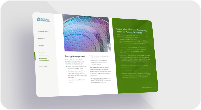 Sustainability Report 2021 62 Sustainability Report 2021 Energy Management Applied Materials is committed to maximizing energy performance and minimizing consumption through: > Continuously monitoring energy use and conducting energy audits > Building optimal energy efficiency into all new facility construction, such as through LEED or Green Mark certification > Purchasing energy-efficient new equipment > Optimizing the temperature of chilled water used in our operations > Transitioning to 100% renewable electricity in the U.S. by 2022 and worldwide by 2030 After several years of relatively flat energy usage, Applied’s energy use increased approximately 7% in 2021 over 2020 as both our operational footprint and demand for our products grew. See the Climate and Energy section of this report for more on Applied’s emissions and renewable power commitments. Conservation, Efficiency, Renewables, and Reuse Projects, Worldwide In 2021, energy and waste reduction efforts produced significant results at multiple Applied Materials sites around the world: > In Gloucester, MA, energy saving measures including air-flow, chiller, and boiler optimizations and LED lighting retrofits saved 1,379,213 kWh in 2021, while the site’s wind turbine delivered 5,801,148 kWh of energy. > Our facility in Xi’an, China, converted 180 light panels in newly reopened offices to LED, saving up to 41k kWh per year, and the facility’s installed solar capacity generated 39,836 kWh in clean electricity. > In Taichung City, Taiwan, replacement of T5 fluorescent tubes with LED lighting produced a savings of 26,700 kWh in 2021. Reuse of wooden crate packaging is preventing half a ton of wood per month from going to landfill. Installation of a new pipeline and flow meter is reclaiming 1 ton of cooling tower water daily for reuse in flush toilets. > Our Israel facilities made efficiency improvements to lighting, air handling units, chillers, and variable speed drives (for pumps). Two cafeterias replaced disposable cups and spoons with reusables, saving approximately 1.2 million cups per year. > At our Santa Clara, CA and Austin, TX facilities, our COVID protocols included replacing manual restroom fixtures with sensor-activated models, reducing touchpoints while also optimizing water use. Sustainability Report 2021 62 INTRODUCTION PURPOSE PEOPLE PLANET Climate and Energy Environmental Health and Safety PROGRESS