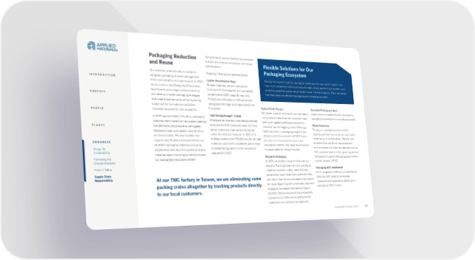 Sustainability Report 2021 79 Packaging Reduction and Reuse Our precision products require carefully designed packaging to avoid damage from shock and vibration during transport. In 2021, we launched a new Design for Distribution task force to encourage up-front planning and develop smarter packaging strategies that meet those demands while improving sustainability via materials reduction, improved recyclability, and reusability. In 2021, approximately 75% of our packaging materials were made from recyclable materials (polyethylene, polypropylene, corrugated fiberboard, steel, and wood), many of which are also reusable. We also enacted new supplier specifications that prohibit the use of certain packaging materials (including polystyrene) and require suppliers to report materials data, improving our ability to track our packaging’s recyclable content. Going forward, we are developing processes to track and enforce compliance with those specifications. Ongoing initiatives are detailed below. Lighter Polyethylene Bags To save materials, we are moving from 6 mil to 4 mil thickness for our low-density polyethylene (LDPE) bags. By year-end FY2022 we anticipate a >75% conversion rate globally for bags purchased directly for final goods. “Just Strong Enough” Crates Where earlier wooden crate designs tended to be overbuilt for most use cases, our new, lighter crates are matched to the precise needs of individual products. In 2021, this strategy saved some 271,000 pounds of crate materials, and continuing efforts are on track to raise that figure to 1 million pounds by year-end FY2022. Hybrid Crate Design For lighter product shipments, we have begun using hybrid crates that pair a wooden base with a corrugated kraft board top and full moisture-barrier bagging inside. Offering a 50% reduction in packaging weight, these designs save the equivalent of 3,917 trees annually, trim transport emissions and packaging material cost, ease recycling and increase safety for freight handlers. Reusable Packaging In 2021, we piloted a program that uses our Logistics Tracking System to track packaging materials (wooden crates, metal fixtures), collect them post-install from customer sites, and return them to the manufacturing location for reuse. Beginning with a domestic loop from Singapore, we tested international loops in Q3 2021. We are also exploring a reusability process for our 500-pound pallets and for crates from our contract manufacturers. Reusable Packaging Labels Labels communicate to the end user that our packaging is reusable and must not be discarded. Waste Reduction To keep our packaging out of landfills, Applied prohibits the use of non-recyclable materials such as Styrofoam. We also plan to restrict the use of non-recyclable and environmentally burdening materials such as PVC and toxic foams in the upcoming revision of Applied’s Supplier Packaging Specification due for release in FY22. Packaging ESG Dashboard An in-progress initiative is using existing SMS and SAP systems to develop measurement dashboards detailing our packaging’s ESG impact. Flexible Solutions for Our Packaging Ecosystem Having real-world impact on packaging waste requires real-world insight—into how much protection individual products need, where we are shipping them, and what the capacities are for recycling and reuse in those locations. Then, we design the most resource-efficient packaging and processes to match. At our TMC factory in Taiwan, we are eliminating some packing crates altogether by trucking products directly to our local customers. INTRODUCTION PURPOSE PEOPLE PLANET PROGRESS Design for Sustainability Promoting the Circular Economy Product Safety Supply Chain Responsibility
