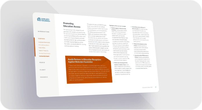 Sustainability Report 2021 27 27 Promoting Education Access To inspire young minds, prepare the next generation of innovators, and pave the way to more promising futures, Applied Materials and the Applied Materials Foundation work continuously to give students worldwide equitable access to high-quality education. In FY2021, Applied Materials and the Foundation provided $2,828,701 in funding to 63 educational initiatives. Throughout the year, as COVID-19 waves forced many schools to cycle between distance, hybrid and in-person learning, we remained flexible in our funding decisions. We listened to school and community leaders, and Applied and the Foundation jointly provided needed tools to reach kids where they are, address learning loss challenges and bolster teacher enthusiasm. Applied and the Foundation funded programs to address the mental health needs of kids returning to classrooms and supported high- quality STEM education programs so kids from all backgrounds and income levels can envision future careers in technology. Highlights at the local level included: > Flexible support in East San José, California. The Foundation worked closely with school districts and education nonprofits serving the predominantly working-class, immigrant families of East San José, who have been disproportionately impacted by the pandemic. Foundation grantees City Year San José/Silicon Valley and Catholic Charities offered in-person learning pods for children of essential workers and others while most students learned remotely. When schools reopened onsite, these organizations maintained their commitment to student learning through in-school support and after- school enrichment programs. > Professional development for teachers in Austin, Texas. In the Manor Independent School District, the Foundation funded a program that trains teachers in new strategies for equitably and effectively engaging students during distance learning. > Illuminating career pathways in Massachusetts. Foundation grantees including Leap for Education and Gloucester Marine Genomics Institute were able to offer in-person experiential learning and career exploration projects that introduced youth to career pathways while complying with public health guidelines. > Taking science programs online in Korea. Applied expanded our relationship with ChildFund Korea, providing funding to convert experimental science lessons to an online format for distance learning. > Improving online STEM access in Taiwan. Applied supported efforts by the Association of Taiwan Online Education Development to improve access to online STEM programs by creating science experiments and other online resources for 5th to 9th graders, all available free to teachers. Sustainability Report 2021 Austin Partners in Education Recognizes Applied Materials Foundation In Texas, Austin Partners in Education, a nonprofit organization working in partnership with the Austin Independent School District, named the Applied Materials Foundation as its Donor Champion of the Year for 2021, for its support of organizations promoting college readiness. Nicole Wayman, a 26-year Applied employee, was also named Volunteer of the Year for leading efforts to build an outdoor theater for McCallum High School, allowing students to conduct rehearsals and performances, attend lectures, and schedule club meetings safely during the pandemic. INTRODUCTION PURPOSE Corporate Governance Ethics & Compliance Public Policy Data & IP Security Personal Data Privacy Community Impact PEOPLE PLANET PROGRESS