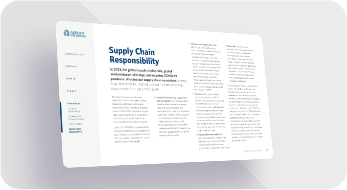 Sustainability Report 2021 75 Sustainability Report 2021 75 Supply Chain Responsibility In 2021, the global supply chain crisis, global semiconductor shortage, and ongoing COVID-19 pandemic affected our supply chain operations in ways large and small but did not prevent us from achieving progress on our supply chain goals. Throughout the year, we also saw a significant uptick in employee and team investment, enthusiasm, and shared responsibility around achieving the goals of our SuCCESS2030 initiative, a 10-year roadmap for extending our sustainability vision across the supply chain for our semiconductor and display businesses. Under SuCCESS2030, our assessments of supplier performance and capabilities require shared commitments in five main ESG focus areas, most of which include defined performance targets. > Supplier Responsibility, Engagement, and Assessment: Applied strives to be a partner to our suppliers, providing resources, guidelines, tools, and trainings to build capacity on advancing sustainable practices. We also support our suppliers and sub-tier suppliers in their efforts to conform to the Responsible Business Alliance (RBA) code of conduct. From this baseline, we can better gauge progress using RBA assessments and audits. > Inclusion and Supplier Diversity: Mirroring our own I&D journey, SuCCESS2030 promotes development of robust diversity strategies throughout our supply chain. Our near-term supplier diversity targets include increased representation of women and other underrepresented groups and increased percentage spend with women- and minority- owned businesses, all by 2024. We are also working with our trade associations to significantly grow the pipeline of diverse talent available to the industry by 2030. > Packaging: Our precision tools and products require carefully designed packaging to avoid damage during transport, and we are continuously exploring strategies to reduce packaging waste, including redesigning cases and crates for reuse, using recyclable material such as corrugated fiberboard for boxes, and doing testing and measurement to gauge the feasibility of reducing virgin materials usage. > Transportation and Logistics: To reduce emissions from airfreight, we are exploring the use of intermodal shipping options that can deliver product within a reasonable time frame. > Wastewater: Though our own operations are neither water-intensive nor major emitters of wastewater, we recognize the need to reduce our industry’s large footprint in both areas. At suppliers with the requisite capabilities, we are exploring a process of pre-treating metal surfaces for rust protection using zinc oxide. The new process replaces phosphates, which can damage aquatic systems when released in wastewater. SuCCESS2030 strengthens Applied’s ESG supply chain strategy, building on our foundation of supporting ethical labor practices, environmentally responsible operations, responsible minerals sourcing, and other programs promoting adherence to industry standards and international human rights standards. SuCCESS2030 is managed through our SuCCESS2030 Office, which oversees metrics and compliance audits and conducts training and coordination with participating suppliers. Across our operations, we conduct pilot programs to test new efficiency and waste- reduction processes, with the intention of sharing key learnings with our supplier partners and magnifying positive impacts across the industry. INTRODUCTION PURPOSE PEOPLE PLANET PROGRESS Design for Sustainability Promoting the Circular Economy Product Safety Supply Chain Responsibility