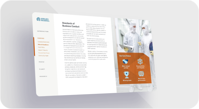 Sustainability Report 2021 14 Standards of Business Conduct Applied Materials’ Standards of Business Conduct communicate our values, set expectations for our global workforce and network of trusted partners, and provide guidance designed to promote the highest ethical standards in our interactions with customers, suppliers, colleagues, communities and other stakeholders. The Standards are designed to promote trust in management’s commitment to our values, empower employees to speak up without fear of retaliation, and provide comprehensive guidance about risks, laws, policies and reporting processes, including key concerns such as conflicts of interest, bribery and corruption. Over the past two years we’ve been working on updates to our Standards and associated policies, procedures, controls and trainings, tying them closer to our core values and emphasizing relevance to today’s dynamic risk environment, everywhere we do business. We will complete our Standards update in 2022, along with the release of a new set of standards for business partners. In 2021, we updated our global Anti-Corruption Policy and our Gifts, Meals, Entertainment and Travel (GMET) Policy. We also updated our Conflict of Interest (COI) new-hire process and added anti-corruption controls to our intern recruitment process. To enable real-time data analytics and insights regarding compliance with our Standards, we maintain a global dashboard for tracking conflict-of-interest disclosures, corporate donation approval requests and GMET approvals. We are currently in the process of building out and automating key elements of our third-party anti-corruption due diligence procedures, and in 2021 we transitioned to conducting regular third-party audits. Our Core Values Most valued partner Winning team Responsibility and integrity World-class performance Sustainability Report 2021 14 INTRODUCTION PURPOSE Corporate Governance Ethics & Compliance Public Policy Data & IP Security Personal Data Privacy Community Impact PEOPLE PLANET PROGRESS