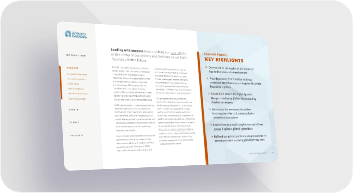 Sustainability Report 2021 10 In 2021, the continuing pandemic, historic global supply chain disruptions, increasing impacts of climate change and social inequities, and growing geopolitical unrest challenged nearly all aspects of society and businesses. At the same time, the transformation to a digital economy continued to accelerate at breakneck speed, tightening pressure on the semiconductor industry to scale at an unprecedented pace. As the global leader in materials engineering, Applied Materials is uniquely positioned to drive significant, meaningful, and lasting environmental and social impact across the world. We recognize this position comes with tremendous responsibility and accountability to our employees, customers, partners, investors, and society. Applied takes a strong stance on corporate governance, holding ourselves to high standards of ethics and integrity, privacy, and data security. Throughout 2021, we continued a systematic review and sharpening of our governance policies and procedures to protect our business and stakeholders amid evolving global threats. We engaged leaders, operators, and employees in dedicated trainings and learning opportunities to reinforce awareness, understanding, and compliance across our organizations and geographies. Our purpose extends to uplifting the communities where we live and work as we aim to create a more just, fair, and humane world. In 2021, we engaged a third-party partner to conduct an equity audit of our community involvement and investments to identify and proactively address unintentional barriers arising from bias, norms, or systemic structures. Building on the outcomes of this audit, we made a public declaration to center our community investments in equity, evolving how we approach grantmaking, employee engagement, and personal and professional development. Leading with purpose means putting our core values at the center of our actions and decisions as we Make Possible a Better Future. Lead with Purpose KEY HIGHLIGHTS > Committed to put equity at the center of Applied’s community involvement > Awarded nearly $13.7 million in direct corporate contributions and Applied Materials Foundation grants > Raised $3.8 million for Fight Against Hunger—including $1.9 million raised by Applied employees > Advocated for economic incentives to strengthen the U.S. semiconductor innovation ecosystem > Established regional compliance committees across Applied’s global operations > Refined our privacy policies and procedures in accordance with evolving global privacy laws Sustainability Report 2021 10 INTRODUCTION PURPOSE Corporate Governance Ethics & Compliance Public Policy Data & IP Security Personal Data Privacy Community Impact PEOPLE PLANET PROGRESS