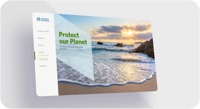 Applied Materials Sustainability Report Page 51 Page 53Sustainability Report 2021 52 Protect our Planet We respect the planet as we shape the future. INTRODUCTION PURPOSE PEOPLE PLANET Climate and Energy Environmental Health and Safety PROGRESS