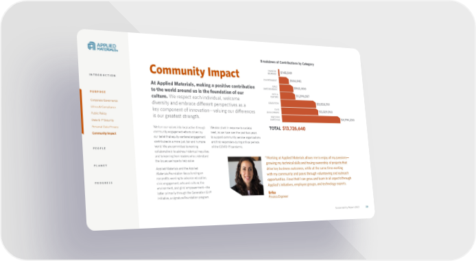 Sustainability Report 2021 20 Sustainability Report 2021 20 We turn our values into local action through community engagement efforts driven by our belief that equity-centered engagement contributes to a more just, fair and humane world. We are committed to working collaboratively to address historical inequities and to learning from leaders who understand the issues we hope to help solve. Applied Materials and the Applied Materials Foundation focus funding on nonprofits working to advance education, civic engagement, arts and culture, the environment, and girls’ empowerment—the latter primarily through the Generation Girl® initiative, a signature Foundation program. We also pivot in response to societal need, as we have over the past two years to support community service organizations and first responders during critical periods of the COVID-19 pandemic. At Applied Materials, making a positive contribution to the world around us is the foundation of our culture. We respect each individual, welcome diversity and embrace different perspectives as a key component of innovation—valuing our differences is our greatest strength. Community Impact Breakdown of Contributions by Category “Working at Applied Materials allows me to enjoy all my passions— growing my technical skills and having ownership of projects that drive key business outcomes, while at the same time working with my community and peers through volunteering and outreach opportunities. I love that I can grow and learn in all aspects through Applied’s initiatives, employee groups, and technology experts. Erika Process Engineer $1,299,057 $2,828,701 $3,029,760 $666,942 $962,400 $145,549 $4,794,230 $13,726,640 DISASTER RESPONSE ENVIRONMENT GIRLS’ EMPOWERMENT ARTS & CULTURE EDUCATION CIVIC DEVELOPMENT EMPLOYEE MATCHING TOTAL INTRODUCTION PURPOSE Corporate Governance Ethics & Compliance Public Policy Data & IP Security Personal Data Privacy Community Impact PEOPLE PLANET PROGRESS