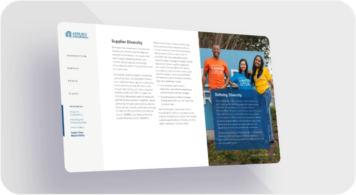 Sustainability Report 2021 80 Supplier Diversity To broaden the impact of our inclusion and diversity commitment, Applied Materials works to build diversity in our supply chain, both through onboarding women- and minority-owned suppliers and through encouraging equitable hiring practices across our supply base. Our supplier diversity program is one of the main pillars of our SuCCESS2030 initiative, and in 2021 we met our goal of increasing our diverse spend by at least 2% year on year, through both existing and newly onboarded diverse suppliers. For 2022, our goal is for 2.5% of our total global spend to reside with certified diverse suppliers. In addition, we are partnering with applicable existing suppliers to pursue their diversity certifications through the Women’s Business Enterprise National Council (WBENC) and National Minority Supplier Diversity Council (NMSDC). Beyond expanding our diverse supplier base, we are also working to integrate equity and inclusion across our procurement operations, adding resiliency to our supply chain. In June 2021, we hired a dedicated supplier diversity program manager and began hosting webinars to help our suppliers boost their own supplier diversity efforts. To measure our progress in alignment with other supplier diversity programs, we employ the RGMA Five Levels of Supplier Diversity framework. Near-term objectives include: > Launching trainings for senior executives, procurement professionals, and commodity business managers > Evaluating opportunities to increase diverse spend within our Tier 1 and Tier 2 supplier base Over the long term, we strive to build a true partnership with our suppliers to drive diversity throughout our supply chain and set a positive example for our industry, all while better meeting our business needs. Defining Diversity Applied Materials’ diverse suppliers must be certified by a third-party auditor as being at least 51% diverse owned, controlled, and operated by U.S. minorities (African- American/Black, Hispanic/Latin-American, Native American, Asian-Pacific American, Asian-Indian American), women, minority women, LGBTQ, persons with disabilities, veterans, or service-disabled veterans. Applied Materials also tracks additional diverse suppliers who could potentially be registered as diverse if they proceed with certification. As a founding member of SEMI’s Manufacturing Ownership Diversity (MOD) working group, Applied Materials is working to provide best practices for supplier diversity in the semiconductor industry. Sustainability Report 2021 80 INTRODUCTION PURPOSE PEOPLE PLANET PROGRESS Design for Sustainability Promoting the Circular Economy Product Safety Supply Chain Responsibility