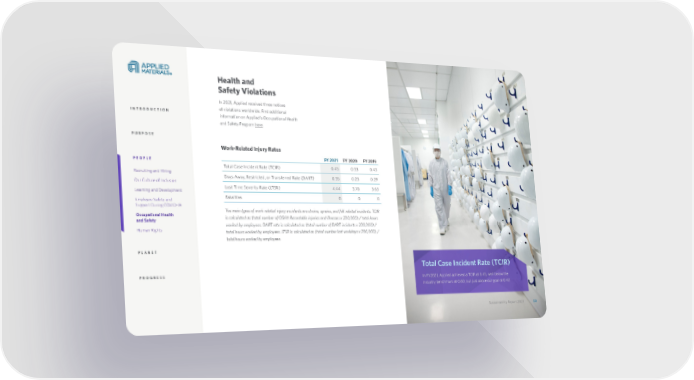 The main types of work-related injury accidents are strains, sprains, and fall-related incidents. TCIR is calculated as (total number of OSHA Recordable injuries and illnesses x 200,000) / total hours worked by employees. DART rate is calculated as (total number of DART incidents x 200,000) / total hours worked by employees. LTSR is calculated as (total number lost workdays x 200,000) / total hours worked by employees. Work-Related Injury Rates Health and Safety Violations In 2021, Applied received three notices of violations worldwide. Find additional information on Applied’s Occupational Health and Safety Program here . Total Case Incident Rate (TCIR) In FY2021, Applied achieved a TCIR of 0.45, well below the industry benchmark of 0.60, but just above our goal of 0.42. Sustainability Report 2021 50 INTRODUCTION PURPOSE PEOPLE Recruiting and Hiring Our Culture of Inclusion Learning and Development Employee Safety and Support During COVID-19 Occupational Health and Safety Human Rights PLANET PROGRESS FY 2021 FY 2020 FY 2019 Total Case Incident Rate (TCIR) 0.45 0.33 0.43 Days Away, Restricted, or Transferred Rate (DART) 0.35 0.23 0.29 Lost Time Severity Rate (LTSR) 4.44 3.70 3.63 Fatalities 0 0 0