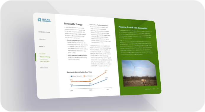 Sustainability Report 2021 57 Powering Growth with Renewables The accelerating digitization of the global economy is creating urgent demand for semiconductors, and Applied Materials is mobilizing our enterprise to deliver the equipment and expertise to meet that demand. At the same time, we understand our success as a business must not come at the expense of the climate and environment. That’s why we are continually seeking new opportunities in the low-carbon economy, such as entering into a Virtual Power Purchase Agreement with White Mesa Wind, a new, 500-megawatt wind project in Crockett County, Texas. Combining the generating power of 180 turbines, White Mesa began commercial operations on October 22, 2021, delivering clean power to offset a large percentage of our U.S. footprint. As our business grows, we will continue innovating operational efficiencies and seeking new renewable energy projects to fulfill our climate commitments. Sustainability Report 2021 Renewable Energy In 2020, Applied Materials committed to 100% renewable electricity use in the U.S. by 2022 and globally by 2030. Our global renewable energy strategy enables achievement of those targets via three complementary approaches: > On-site solar power generation: Applied Materials maintains on-site solar generating capacity at our facilities in Singapore; Austin, TX; Bangalore, India; and Xi’an, China. Combined, these arrays generated 286 MWh of clean power in 2021. > Utility green procurement programs: Direct purchase of renewable energy from a utility provider. > Virtual Power Purchase Agreements: Financial contracts with external solar, wind, and other renewable energy generating projects reduce our Scope 2 emissions inventory by delivering clean power to the grid. Each Renewable Energy Certificate (REC) provided by project owners represents the environmental benefits of 1MWh of electricity generated from renewable sources. In 2021, Applied used over 245,000 MWh of green power from a combination of these sourcing strategies, representing 80% of our total U.S. and 57% of our total global electricity needs for the year. We continue to evaluate further renewable energy projects and in 2021 began partnering with sustainability consultant 3Degrees to define a roadmap for expanding our renewable electricity supply globally and reaching our 2030 100% renewable electricity goal. Renewable Electricity Use Over Time 57 2019 2020 2021 42% 41% 80% 37% 37% 57 % % Global Renewable % US Renewable INTRODUCTION PURPOSE PEOPLE PLANET Climate and Energy Environmental Health and Safety PROGRESS