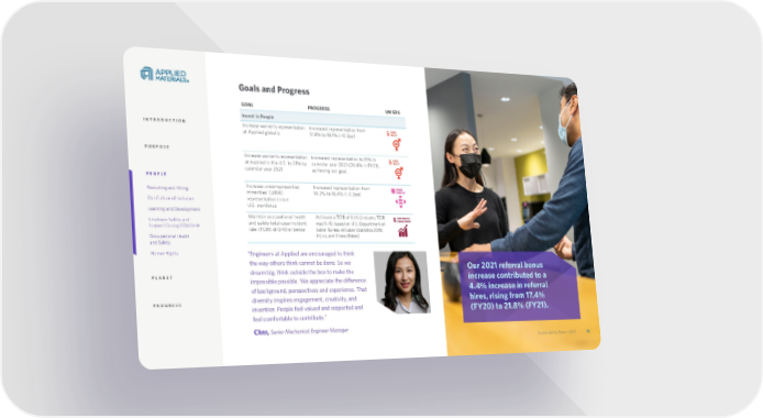 Sustainability Report 2021 32 Sustainability Report 2021 32 Goals and Progress GOAL PROGRESS UN SDG Invest in People Increase women’s representation at Applied globally Increased representation from 17.8% to 18.1% (+0.3pp) Increase women’s representation at Applied in the U.S. to 21% by calendar year 2021 Increased representation to 21% in calendar year 2021 (20.8% in FY21), achieving our goal. Increase underrepresented minorities’ (URM) representation in our U.S. workforce Increased representation from 14.2% to 16.4% (+2.2pp) Maintain occupational health and safety total case incident rate (TCIR) of 0.42 or below Achieved a TCIR of 0.45 (industry TCIR was 0.70, based on U.S. Department of Labor Bureau of Labor Statistics 2018 Injury and Illness Rates) Our 2021 referral bonus increase contributed to a 4.4% increase in referral hires, rising from 17.4% (FY20) to 21.8% (FY21). “Engineers at Applied are encouraged to think the way others think cannot be done. So we dream big, think outside the box to make the impossible possible. We appreciate the difference of background, perspectives and experience. That diversity inspires engagement, creativity, and invention. People feel valued and respected and feel comfortable to contribute.” Cher, Senior Mechanical Engineer Manager Sustainability Report 2021 32 INTRODUCTION PURPOSE PEOPLE Recruiting and Hiring Our Culture of Inclusion Learning and Development Employee Safety and Support During COVID-19 Occupational Health and Safety Human Rights PLANET PROGRESS