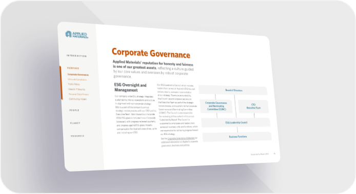 Sustainability Report 2021 11 Sustainability Report 2021 11 Applied Materials’ reputation for honesty and fairness is one of our greatest assets , reflecting a culture guided by our core values and overseen by robust corporate governance. Corporate Governance ESG Oversight and Management Our company-wide ESG strategy integrates sustainability into our operations and culture, in alignment with our corporate strategy. ESG is a part of the company’s annual strategic review process with our CEO and his Executive Team. Work toward our corporate 2030 ESG goals is included in our Corporate Scorecard, with progress reviewed quarterly, and progress against ESG goals impacts compensation for Applied’s executives, up to and including our CEO. Our ESG Leadership Council, which includes leaders from across all Applied’s ESG-focused delivery teams, oversees implementation of our strategy. To ensure accountability, the Council reports progress regularly to the Executive Team as part of the strategic review process, and quarterly to the Corporate Governance and Nominating Committee (CGNC). The Council is also responsible for reviewing all the content in this annual Sustainability Report. The Council is supported by employees and leaders from across all business units and functions, which are responsible for delivering progress toward our ESG strategy. See the Corporate Governance Addendum for additional information on Applied’s corporate governance structures and policies. Board of Directors Business Functions CEO Executive Team Corporate Governance and Nominating Committee (CGNC) ESG Leadership Council INTRODUCTION PURPOSE Corporate Governance Ethics & Compliance Public Policy Data & IP Security Personal Data Privacy Community Impact PEOPLE PLANET PROGRESS