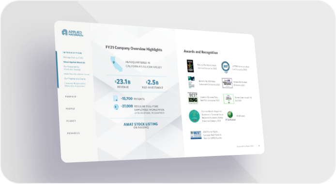 Sustainability Report 2021 4 FY21 Company Overview Highlights Awards and Recognition Fortune The World’s Most Admired Companies 2022 JUST100 America’s Most Just Companies 2022 Barron’s Top 100 Most Sustainable Companies 2021 Forbes World’s Best Employers 2021 Investor’s Business Daily Best ESG Companies 2021 Forbes Green Growth 50 List 2021 FTSE4Good CommonWealth Magazine’s Excellence in Corporate Social Responsibility Award, Foreign Enterprise Category, 2021 HEADQUARTERED IN CALIFORNIA’S SILICON VALLEY $ 23.1 B REVENUE ~15,700 PATENTS AMAT STOCK LISTING ON NASDAQ $ 2.5 B R&D INVESTMENT ~27,000 REGULAR FULL-TIME EMPLOYEES WORLDWIDE (>115 LOCATIONS, 19 COUNTRIES) INTRODUCTION Message from our CEO About Applied Materials Our Sustainability Vision and Strategy Make Possible a Better Future Our Progress at a Glance Corporate Responsibility Materiality Assessment PURPOSE PEOPLE PLANET PROGRESS 2022 Human Rights Campaign Best Places to Work for LGBTQ Equality