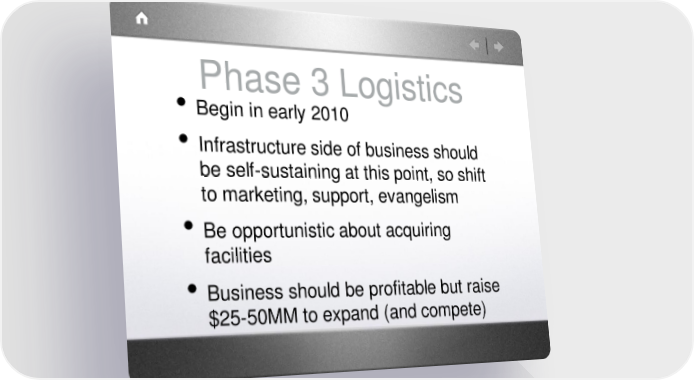 Phase 3 Logistics • Begin in early 2010 • Infrastructure side of business should be self-sustaining at this point, so shift to marketing, support, evangelism • Be opportunistic about acquiring facilities • Business should be profitable but raise $25-50MM to expand (and compete)