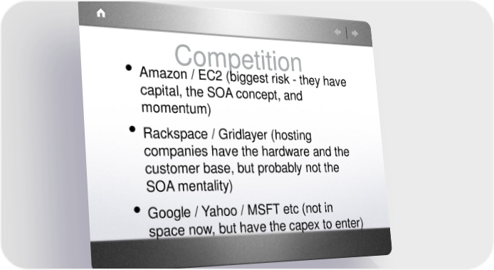 Competition • Amazon / EC2 (biggest risk - they have capital, the SOA concept, and momentum) • Rackspace / Gridlayer (hosting companies have the hardware and the customer base, but probably not the SOA mentality) • Google / Yahoo / MSFT etc (not in space now, but have the capex to enter)