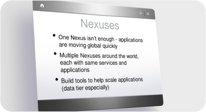 Nexuses • One Nexus isn’t enough - applications are moving global quickly • Multiple Nexuses around the world, each with same services and applications • Build tools to help scale applications (data tier especially) AppNexus Page 11 Page 13